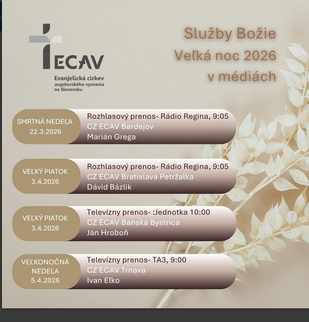 Prijmite pozvanie na EKUMENICKÝ PAŠIOVÝ SPRIEVOD V LEVOČI, ktorý sa uskutoční na Veľký piatok 29. marca. Sprievod sa začne pred Evanjelickým kostolom na Námestí Majstra Pavla o 13.00 h.
